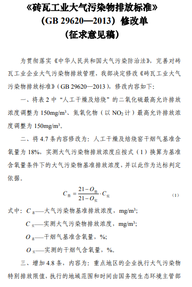 磚瓦工業大氣污染物排放標準修改單(征求意見稿)