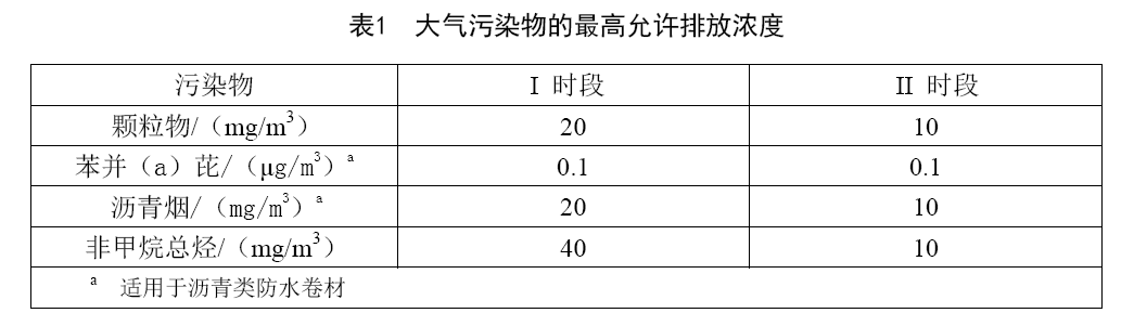 瀝青類防水卷材生產過程中,生產線以單位產品重量核算的瀝青煙排放總量執行表2規定。