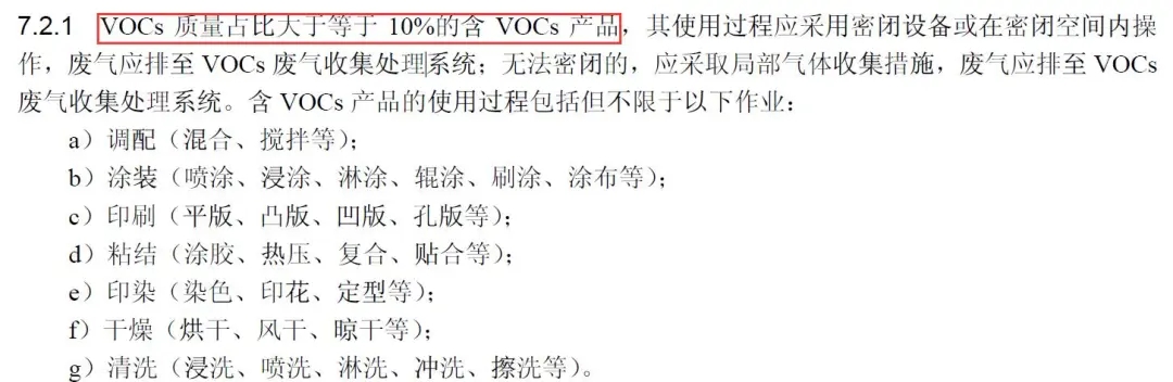 無組織收集:鼓勵源頭削減,企業(yè)使用的原輔材料和產(chǎn)品中VOCs含量占比小于10%(質(zhì)量含量),根據(jù)本標準的相關(guān)規(guī)定豁免相應(yīng)的措施要求;可不要求采取無組織排放收集措施。