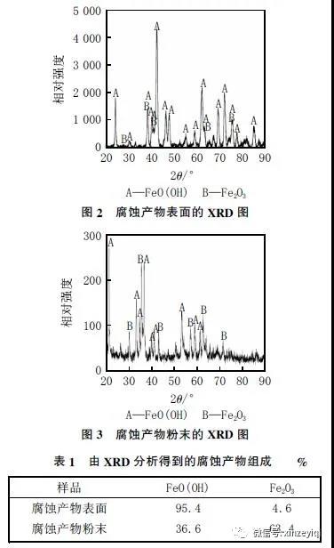 分別對熱管換熱器爐管外側的翅片腐蝕產物表面和腐蝕產物粉末進行了XRD 檢測,結果分別見圖2和圖3,由XRD 分析得到的腐蝕產物組成見表1。從表1 可知,腐蝕產物表面主要成分為FeO(OH),而腐蝕產物粉末主要成分為Fe2O3 和FeO(OH)。