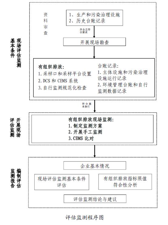 企業或接受委托的技術機構在開展現場評估監測前,應對相關資料進行認真審查,對資料齊全且符合要求的,可開展現場勘查。資料審查和現場勘查符合基本條件的,開展現場評估監測工作;不符合基本條件的,企業應按要求整改完善后,再開展現場評估監測工作。完成現場評估監測,企業或接受委托的技術機構應編制評估監測報告,給出明確的評估監測結論和建議。評估監測程序詳見下圖。