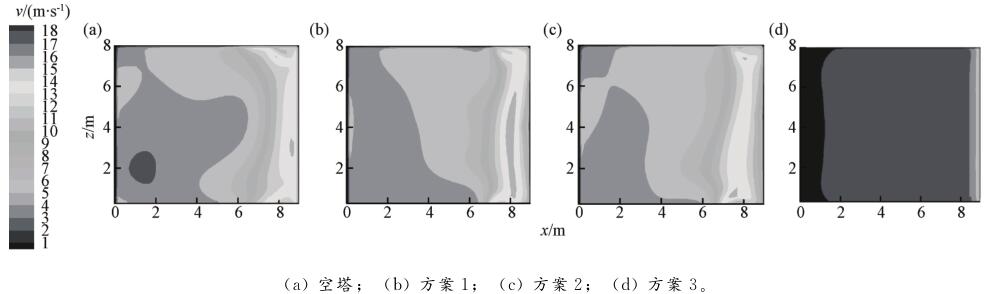 相比于空塔,導流板的設置對流場起到了分流的作用。前者氣流較紊亂,從上部至下部速度梯度明顯;后者流場均勻性得到改善,速度梯度較小。