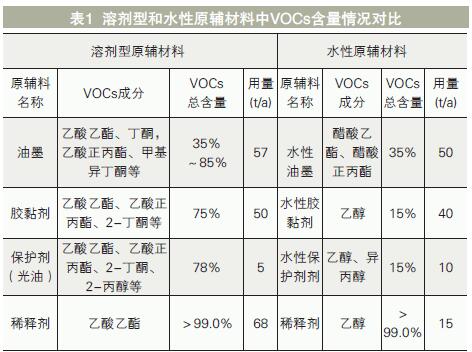 某薄膜印刷企業(yè)分別采用溶劑型和水性原輔材料生產(chǎn)同一產(chǎn)品的情況下,VOCs的成分及含量對(duì)比情況見表1。該企業(yè)改用水性材料后,VOCs產(chǎn)生量減少了約80%??梢姴捎盟栽o材料可大大減少VOCs排放種類和數(shù)量。