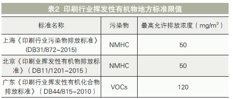 塑料軟包裝印刷企業(yè)產(chǎn)生的廢氣量較大,大部分企業(yè)VOCs濃度在5000ppm以下,屬中低濃度,其中烘干廢氣的溫度通常在50~80℃,VOCs年排放總量大。目前國(guó)內(nèi)對(duì)于印刷行業(yè)VOCs排放執(zhí)行的標(biāo)準(zhǔn)主要為地方標(biāo)準(zhǔn),具體見表2。南京地區(qū)主要參照的是上海市《印刷行業(yè)污染物排放標(biāo)準(zhǔn)》(DB31/872-2015)。