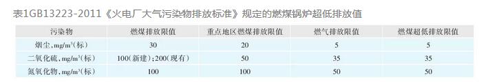 GB13223-2011《火電廠大氣污染物排放標(biāo)準(zhǔn)》確定的燃煤鍋爐超低排放值見(jiàn)表1。