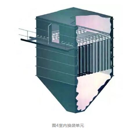 2005年,結(jié)合琉璃河水泥廠窯尾電除塵器改造,我們開始推出凈氣室室內(nèi)換袋結(jié)構(gòu)的袋除塵器(圖4),大大降低了整機(jī)漏風(fēng)率。