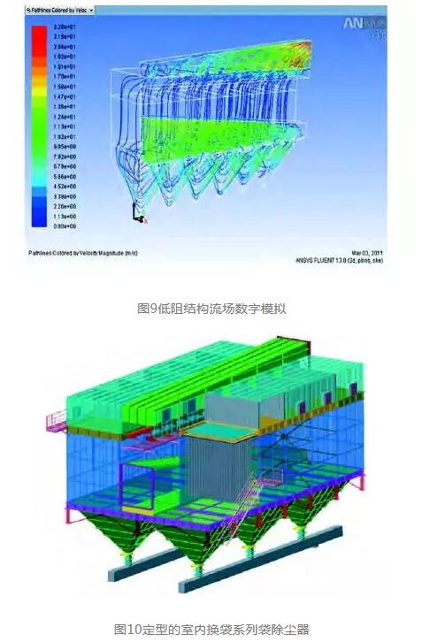實(shí)際上,該綜合平臺(tái)是我們?cè)谏a(chǎn)過(guò)程中分段研發(fā)的。首先通過(guò)數(shù)字流場(chǎng)計(jì)算的模擬,確定了公司標(biāo)準(zhǔn)袋除塵器系列及多種非標(biāo)改造的低阻結(jié)構(gòu)(圖9、10)。