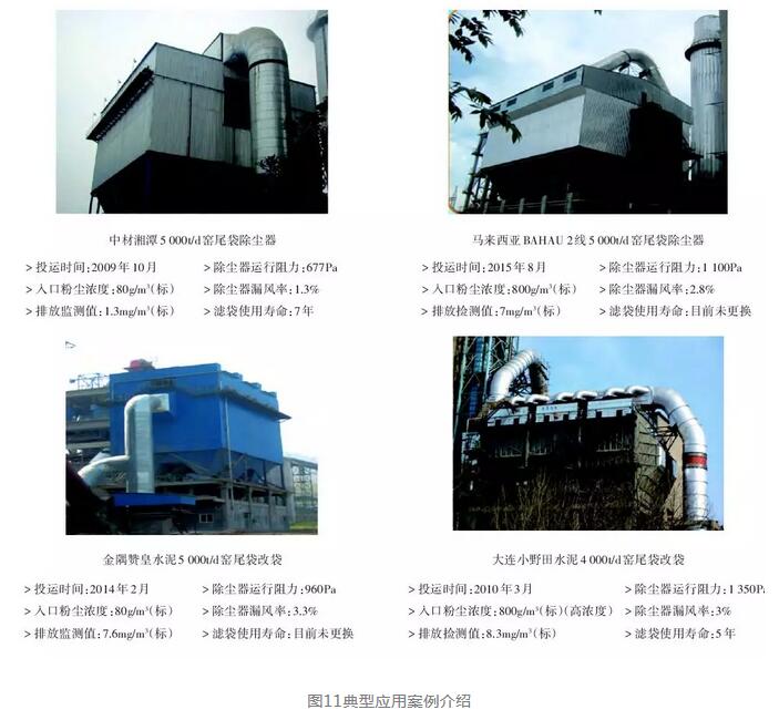 項(xiàng)目技術(shù)成果應(yīng)用在公司袋除塵器設(shè)計(jì)的四大產(chǎn)品系列和幾百臺(tái)“電改袋”除塵器改造,大大縮短了產(chǎn)品設(shè)計(jì)周期,有效提升了袋除塵器的各項(xiàng)技術(shù)指標(biāo)和工作可靠性,穩(wěn)定達(dá)到低排放效果,設(shè)備平均運(yùn)行阻力降低,節(jié)能環(huán)保效果明顯。圖11為幾個(gè)典型應(yīng)用案例。