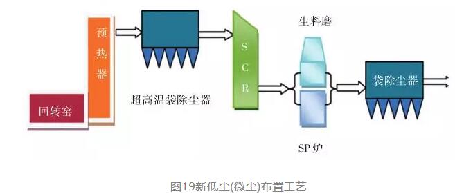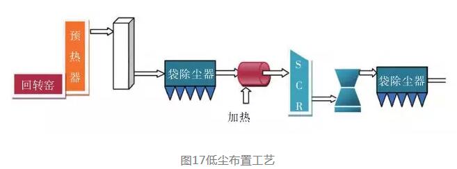 圖17為傳統(tǒng)的低塵布置工藝,采用傳統(tǒng)的高溫袋除塵器可以保證進(jìn)入SCR反應(yīng)器的廢氣含塵量極低,這樣粉塵對(duì)SCR催化劑的影響小。但由于傳統(tǒng)濾袋的耐溫限制,通常需要采用六級(jí)預(yù)熱器,或優(yōu)先通過(guò)SP余熱鍋爐降溫,或采用增濕塔將預(yù)熱器出口廢氣溫度降低到≤280℃,并且不允許出現(xiàn)超溫事故。降溫除塵后,為了滿足氮氧化物最佳催化還原反應(yīng)溫度,需要對(duì)煙氣進(jìn)行再加熱,這無(wú)疑會(huì)使工藝復(fù)雜且有能源消耗。如果研發(fā)出有效可靠的低溫催化劑,無(wú)需對(duì)氣體再加熱,則是一個(gè)理想的選擇。