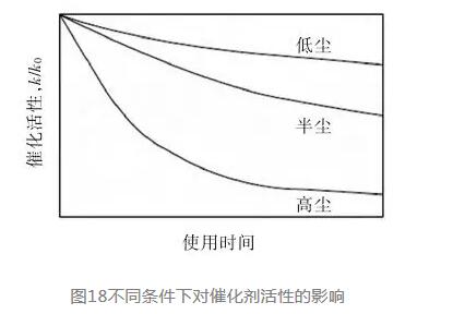 國(guó)外有關(guān)研究實(shí)驗(yàn)結(jié)果給出了催化劑活性使用壽命與氣體含塵量的關(guān)系(見(jiàn)圖18)。由此可見(jiàn),氣體含塵量高會(huì)大大縮短水泥SCR脫硝催化劑的使用壽命,水泥窯尾的高塵布置方案會(huì)更糟。
