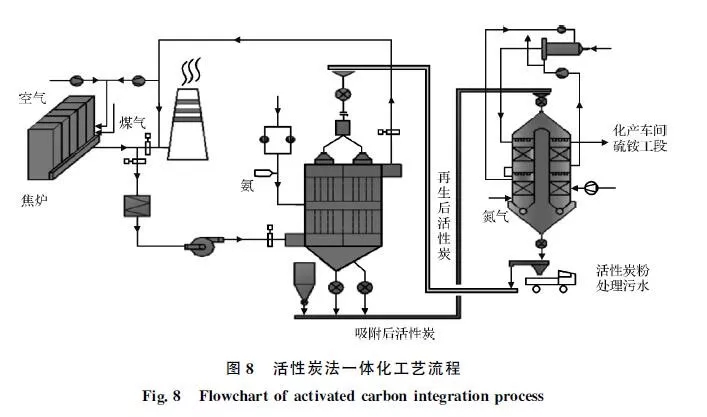 活性炭法具有系統占地面積小,所用物資均可市場采購,特別是該系統充分利用了焦化系統的各項資源,沒有新的污染物產生的優點。但該工藝存在大規模改造應用的經濟性較差問題。